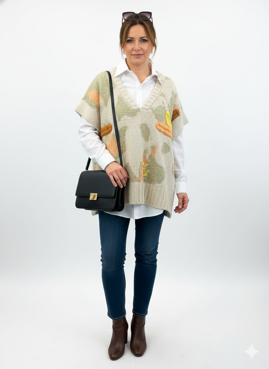 De subtiele kleuraccenten in tinten zoals groen, oranje en geel geven het item een speels en trendy karakter. Dankzij de neutrale beige basis past dit model moeiteloos bij jeans, pantalon of rok en kan het gedragen worden voor zowel casual als smart casual outfits.