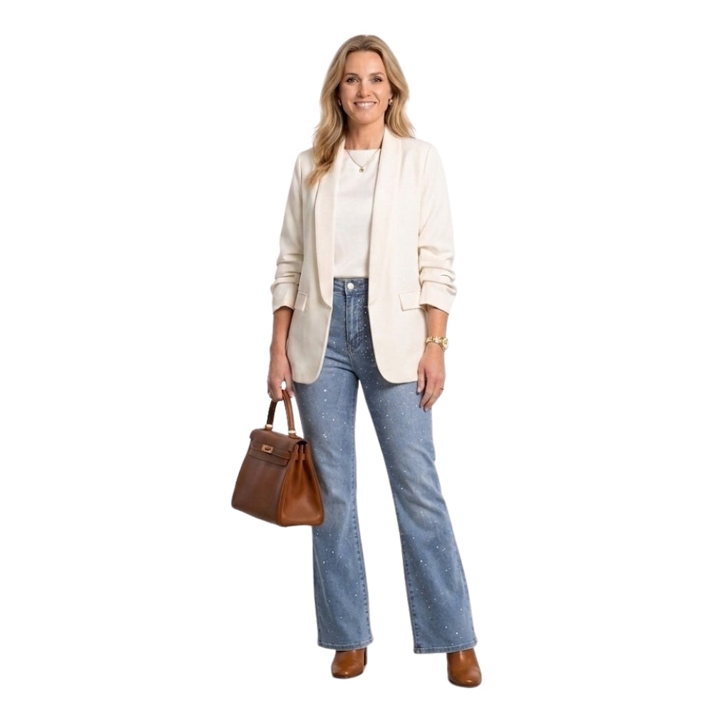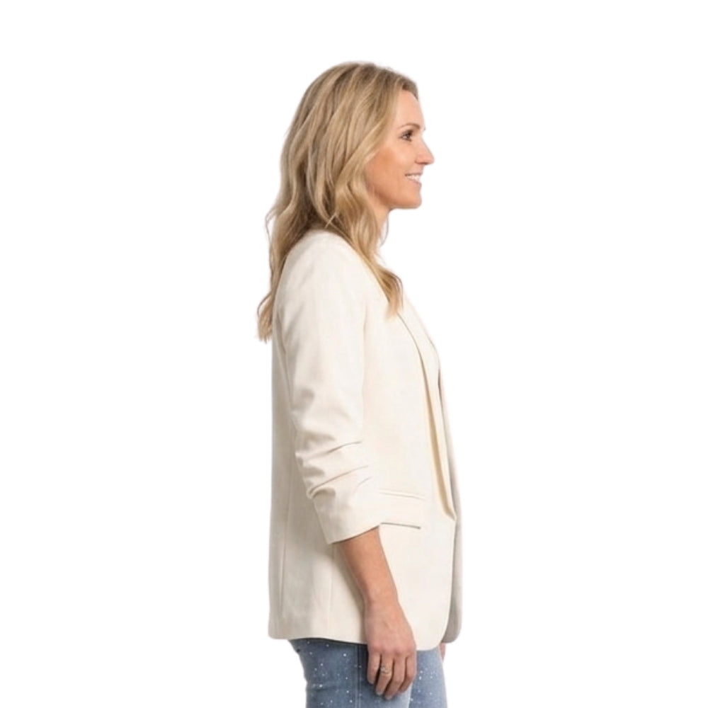 Deze crème blazer met opgehaalde mouwen is de perfecte mix van elegantie en modern minimalisme. Het subtiele stikseldetail en de open voorkant zorgen voor een verfijnde, tijdloze uitstraling.
