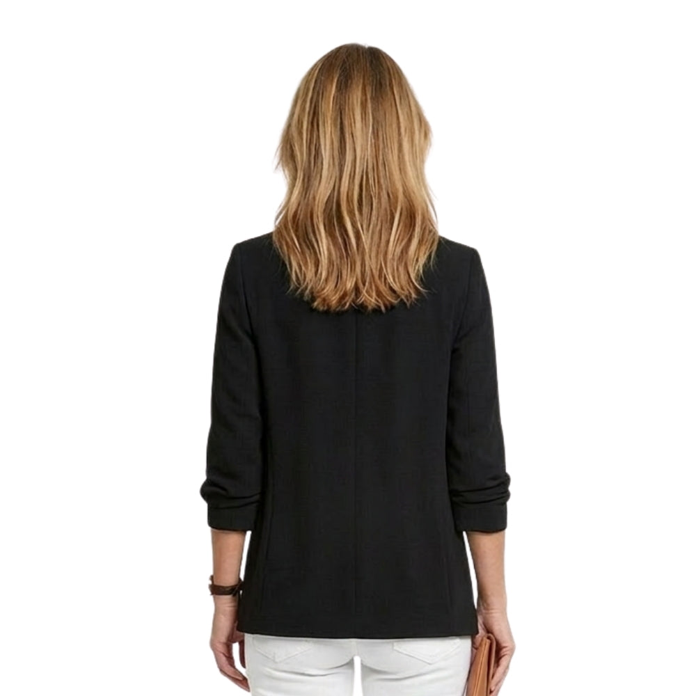 Deze zwarte blazer met opgehaalde mouwen is een echte must-have voor elke garderobe. De strakke lijnen en subtiele stikseldetails zorgen voor een moderne en stijlvolle uitstraling die zowel zakelijk als casual gedragen kan worden.