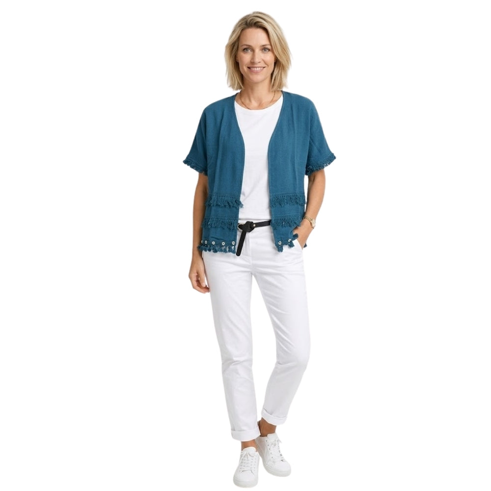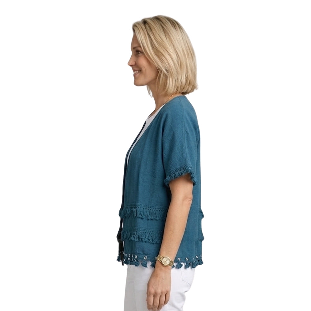 Dit petrolblauwe katoenen vest combineert een stijlvolle uitstraling met een bohemian touch. De franjes en gouden knopen geven het vest een luxe en unieke look die perfect is voor zowel casual als chique outfits.