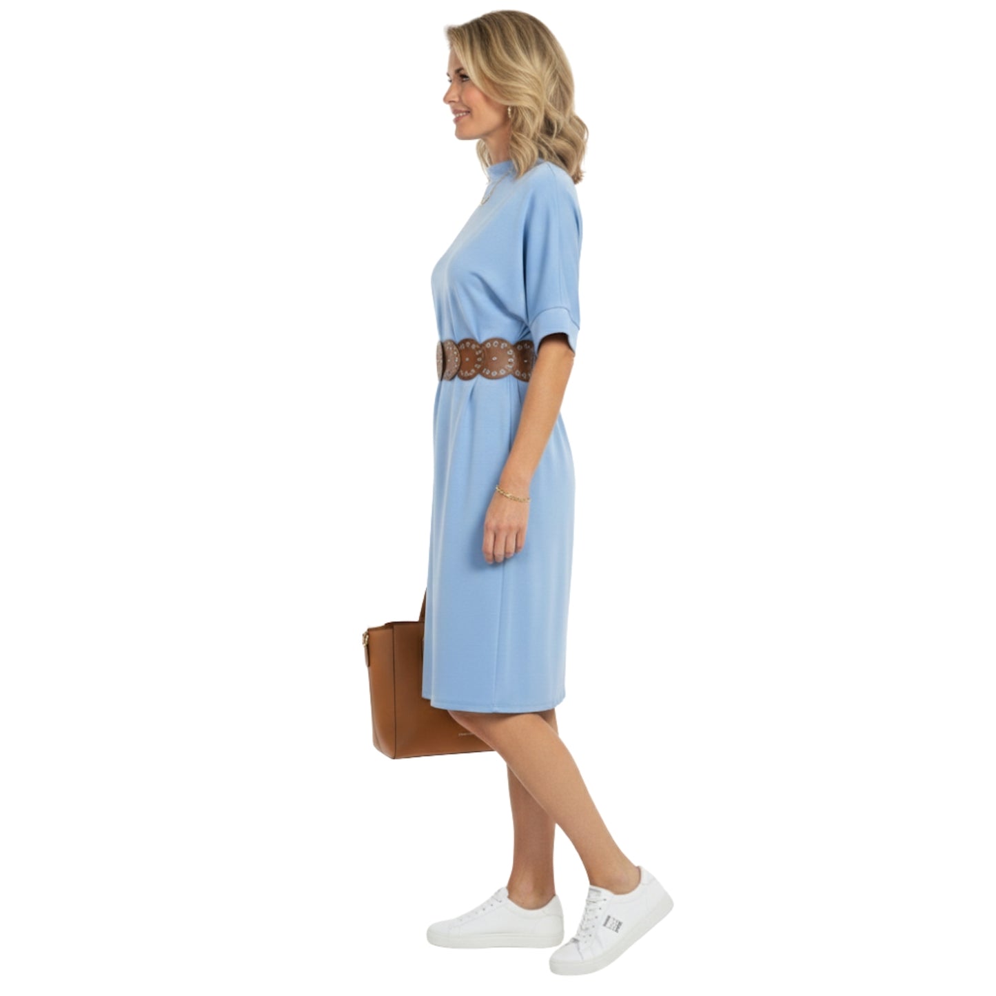 Tijdloze jurk in een stijlvolle blauwe tint met een comfortabele stretchkwaliteit. Een elegant en veelzijdig model dat perfect is voor zowel casual als geklede gelegenheden.