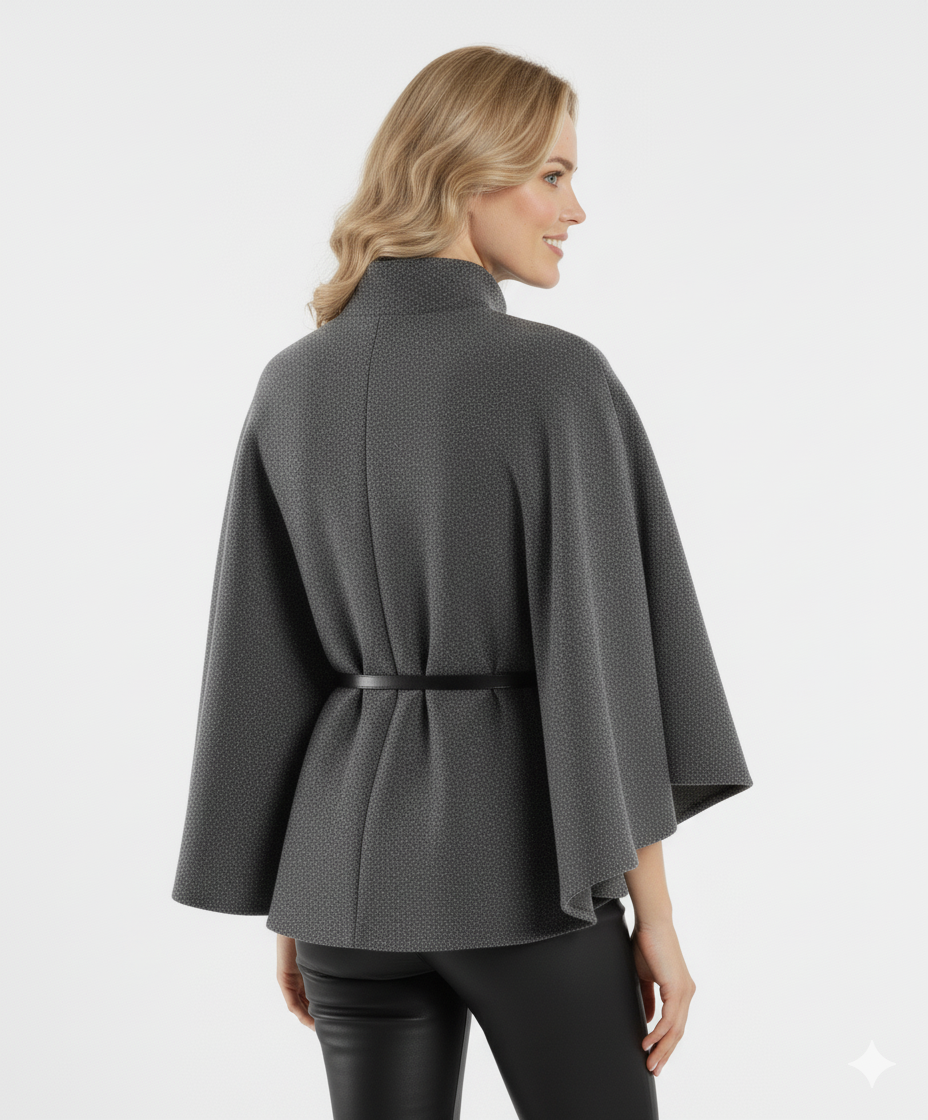 Met deze grijze cape met ceintuur voeg je een vleugje elegantie toe aan elke look — een verfijnd item dat stijl en warmte perfect combineert.