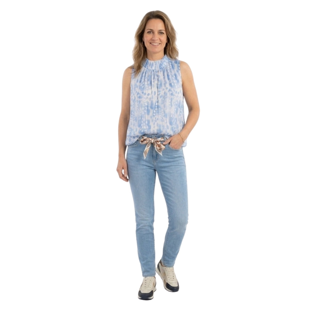 Deze mouwloze top met col in hemelblauw geeft je outfit een frisse en verfijnde uitstraling. De subtiele bloesemprint en plissé structuur zorgen voor een stijlvolle, vrouwelijke look die perfect is voor elke gelegenheid.