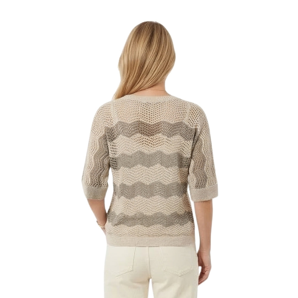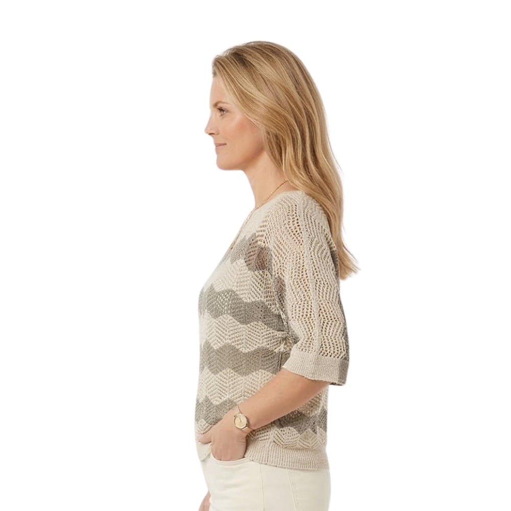 Deze fijngebreide top in beige en taupe tinten combineert comfort met een subtiel stijlstatement. Het elegante zigzag patroon geeft de top een speelse maar verfijnde uitstraling.