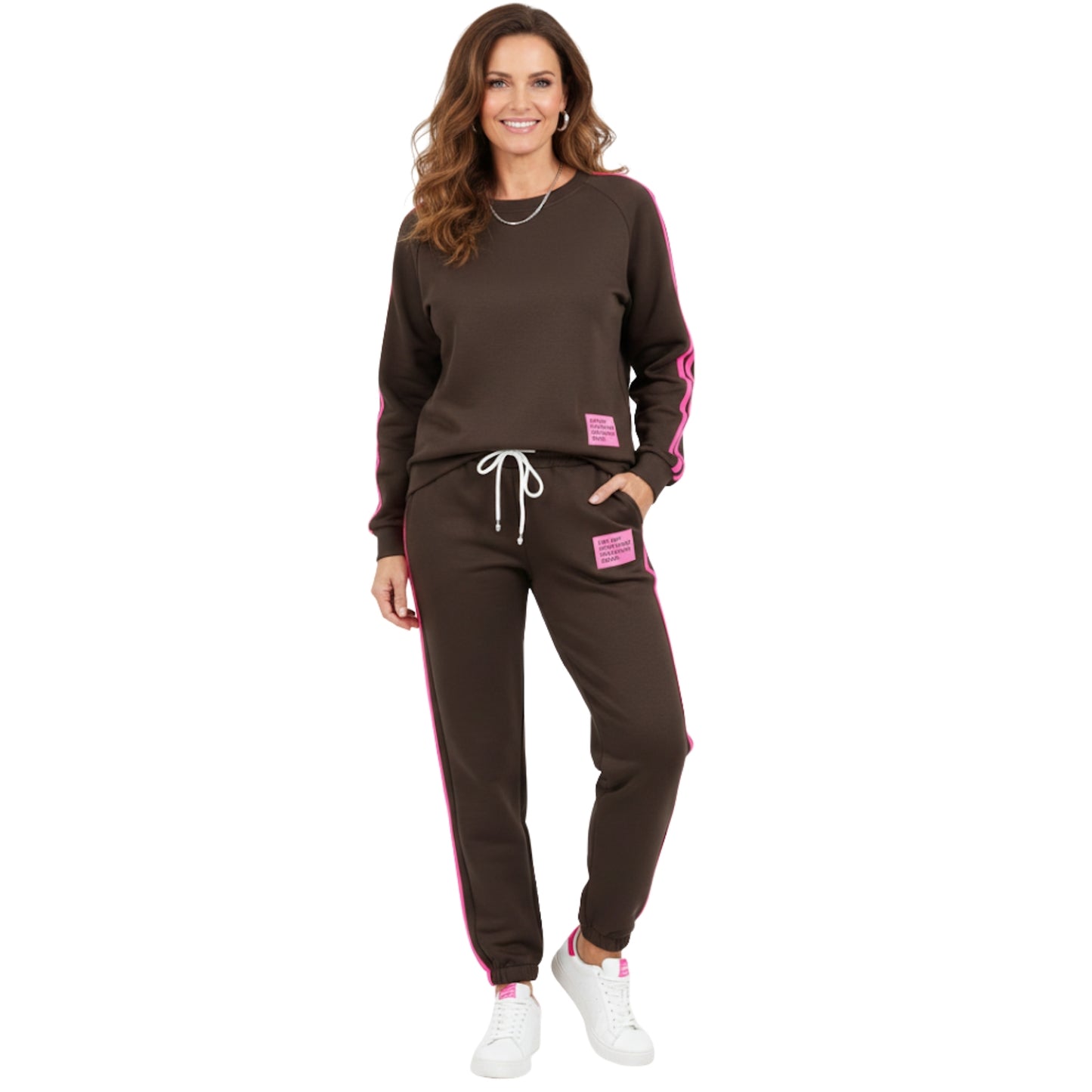 De Set Linda Brown is een stijlvolle en comfortabele two-piece set met een sportieve uitstraling. De warme bruine kleur in combinatie met de opvallende roze contraststrepen geeft deze set een trendy en moderne look.
