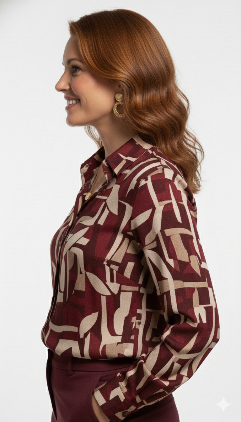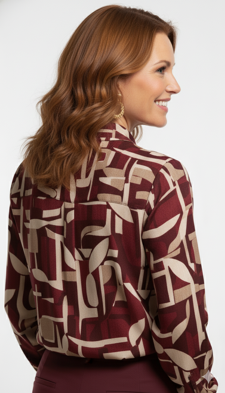 Breng warmte en elegantie in je garderobe met deze prachtige bordeaux abstract print blouse. De luxe kleurencombinatie van bordeaux, beige en zachte bruintinten zorgt voor een chique, moderne uitstraling.