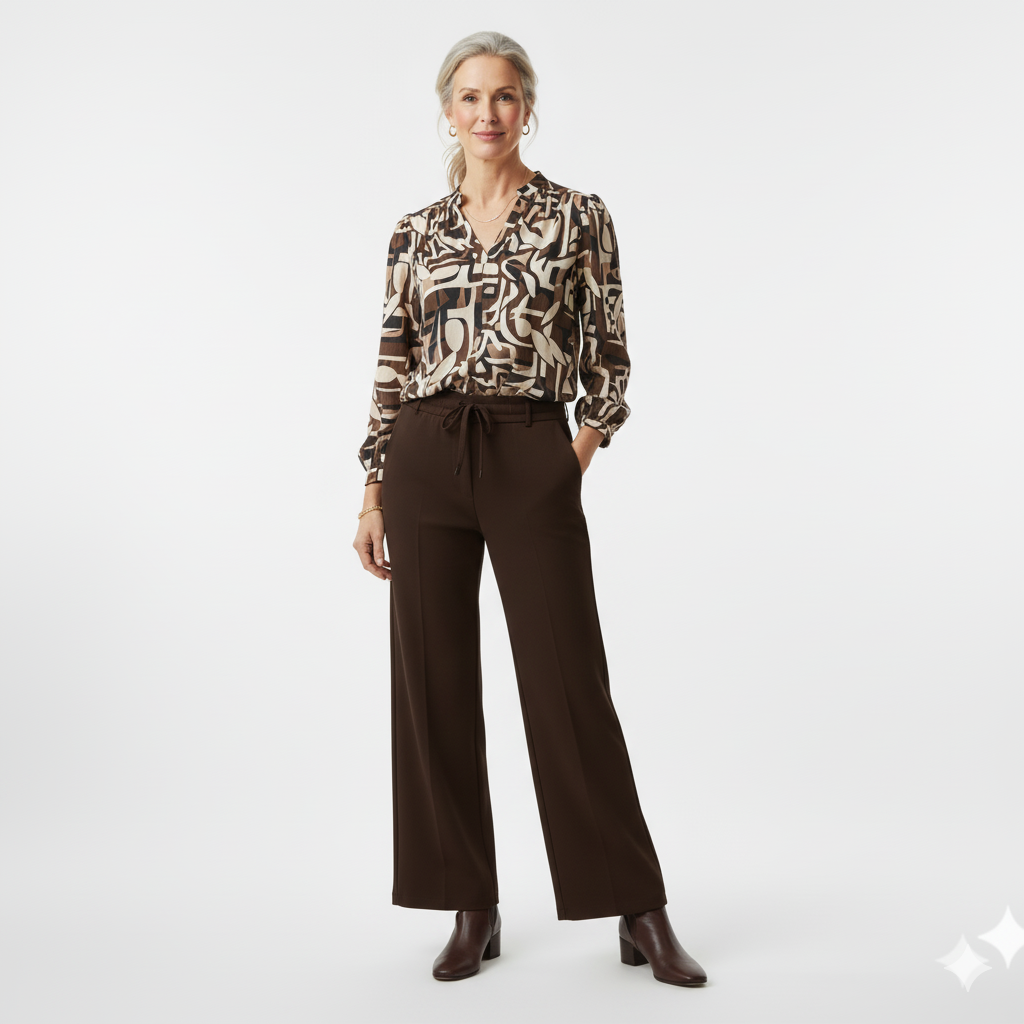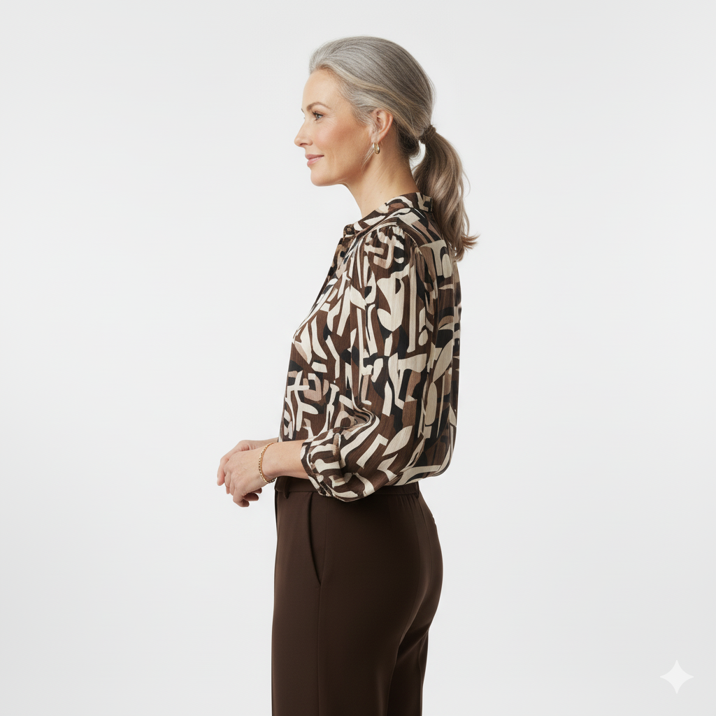 Upgrade je garderobe met deze stijlvolle abstracte print blouse in warme bruin en beigetinten. De moderne grafische print geeft een luxe look, terwijl de elegante V-hals en subtiele schouderdetails zorgen voor een flatterend en vrouwelijk silhouet.