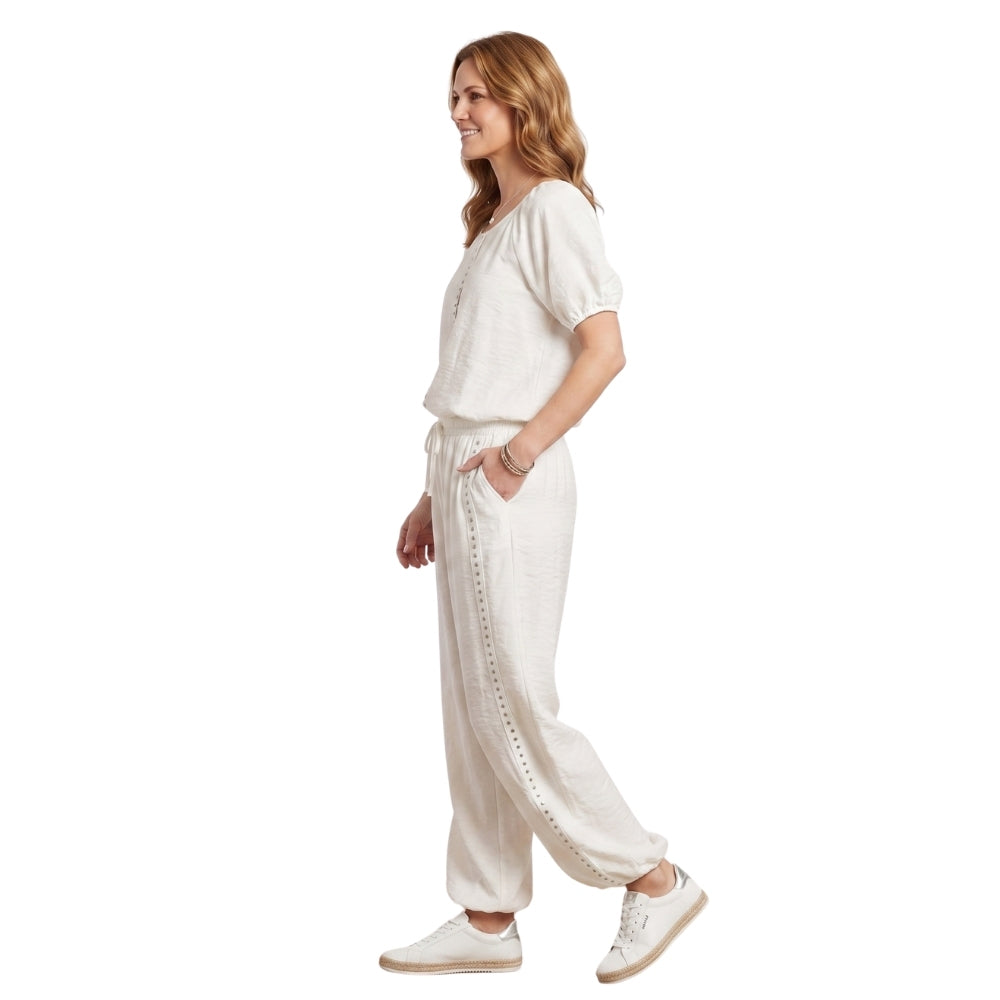 De Tess viscose co-ord set in wit met studs combineert een frisse, minimal look met een stoere twist. De subtiele studs details geven net dat beetje extra sparkle zonder te overheersen.